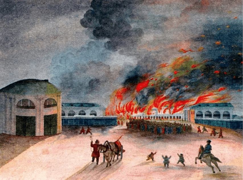 Вечером 17 июня 1837 года в центре Рязани произошёл разрушительный пожар, уничтоживший несколько улиц вокруг Ново-Базарной или Хлебной площади (позже известной как площадь Ленина). Огонь затронул даже Хлебные ряды, ныне известные как Торговые ряды на улицах Краснорядской и Кольцова. Этот пожар стал настоящим потрясением для местных жителей, отразившись в отчетах рязанского губернатора Владимира Прокоповича-Антонского и запечатлённый на картине местного художника Михаила Бровкина.