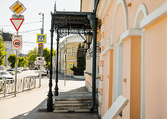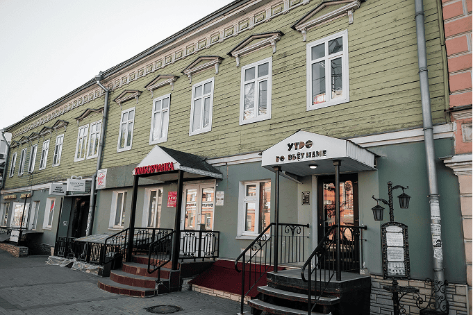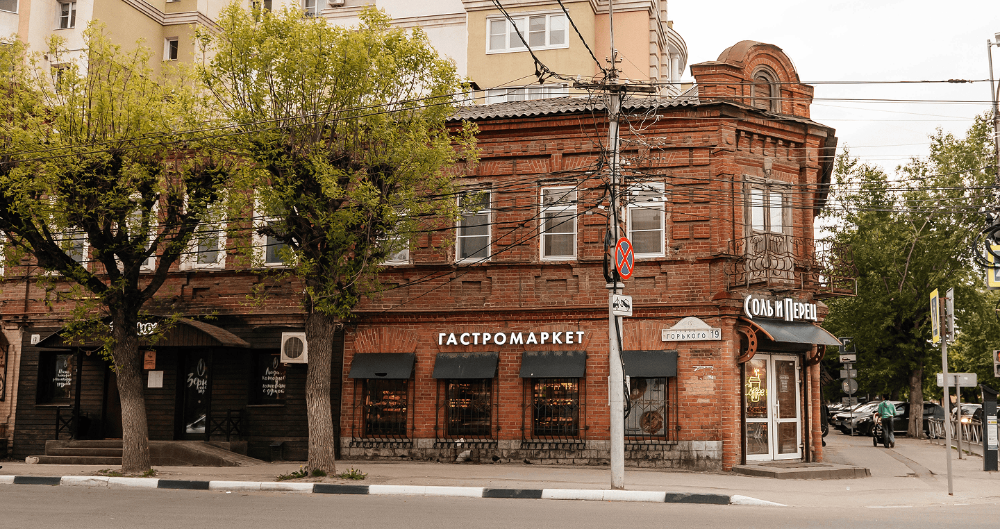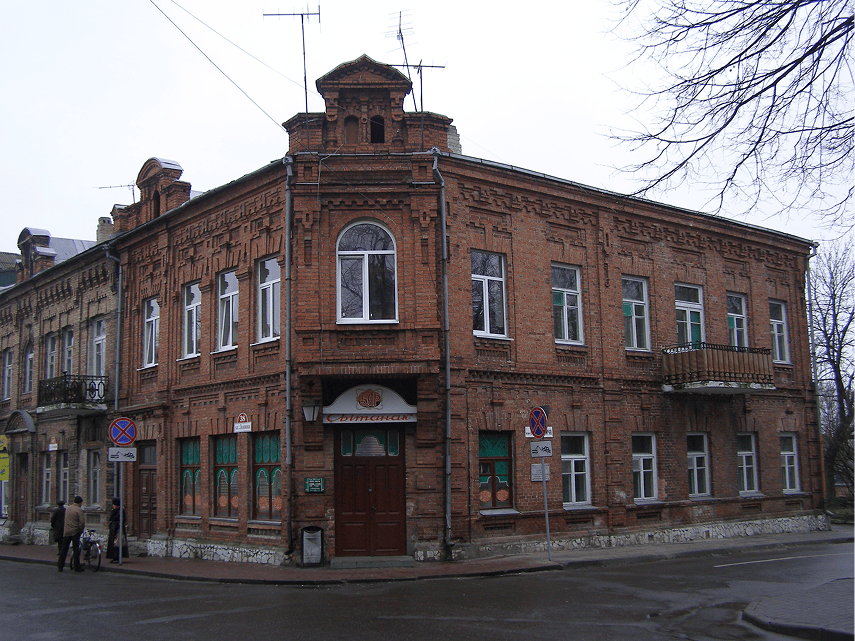 И все-таки типовые дома, многократно повторявшиеся на просторах Российской империи, существовали повсеместно. Так, угловой дом на улице Горького, 19 (на перекрестке с улицей Введенской), где на первом этаже располагались торговые лавки, а на втором — жилые помещения, встречается и в других губернских городах. К примеру, аналогичный дом можно найти на углу двух улиц даже в белорусском Пинске!