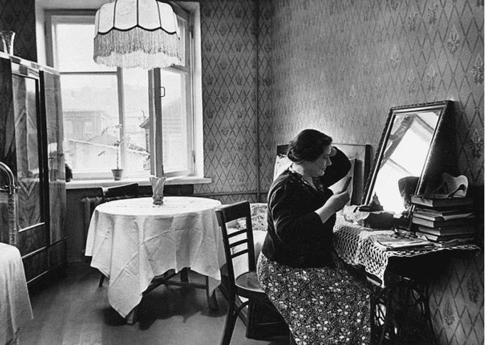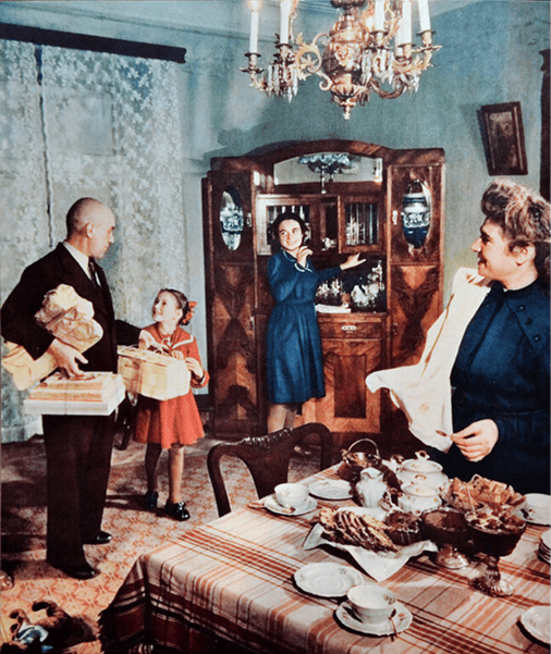 «Дом сталинский», — восхищенно смотрит Ольга на пятиэтажку с застекленными пролетами подъездной лестницы. Дворник, живущий в служебной квартире на первом этаже и выполняющий роль старшего по дому, выдает им с мужем ключи. Водитель грузовика с носильщиком за три сторублевки с портретом Ленина помогают поднять на третий этаж привезенный груз.